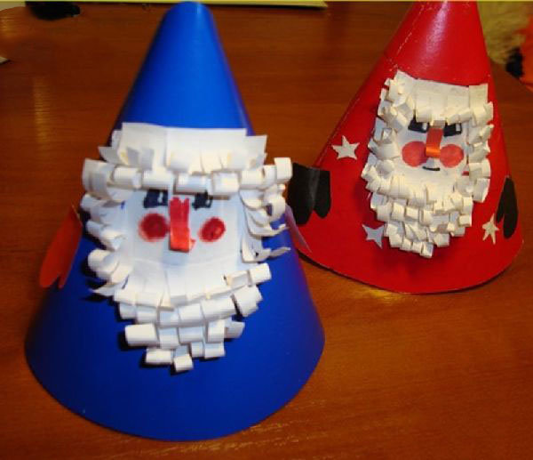 Поэтапное: Из бумаги красного цвета вырезаем круг, в котором делаем надрез со стороны (не доходя до центра). Сворачиваем круг в конус и заклеиваем его края. Руки для Деда Мороза вырезаем из красной бумаги темного оттенка. Теперь делаем варежки и рукавицы, которые вырезаем из белой бумаги. Из этой же бумаги нужно вырезать овал лица, а затем приклеить его в верхней части конуса. Рисуем глаза, нос, рот, а вместо бороды приклеиваем вату. Все, наш сказочный Дед Мороз готов!